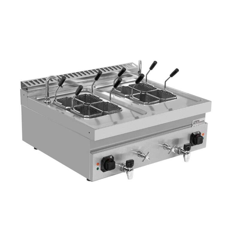 Compact countertop electric pasta cooker with 1 × 12 L capacity, designed for fast and efficient boiling in professional kitchens. Equipped with AISI 304 stainless steel tank, adjustable temperature up to 110 °C, safety thermostat, water inlet tap and front drain valve for easy operation and cleaning.